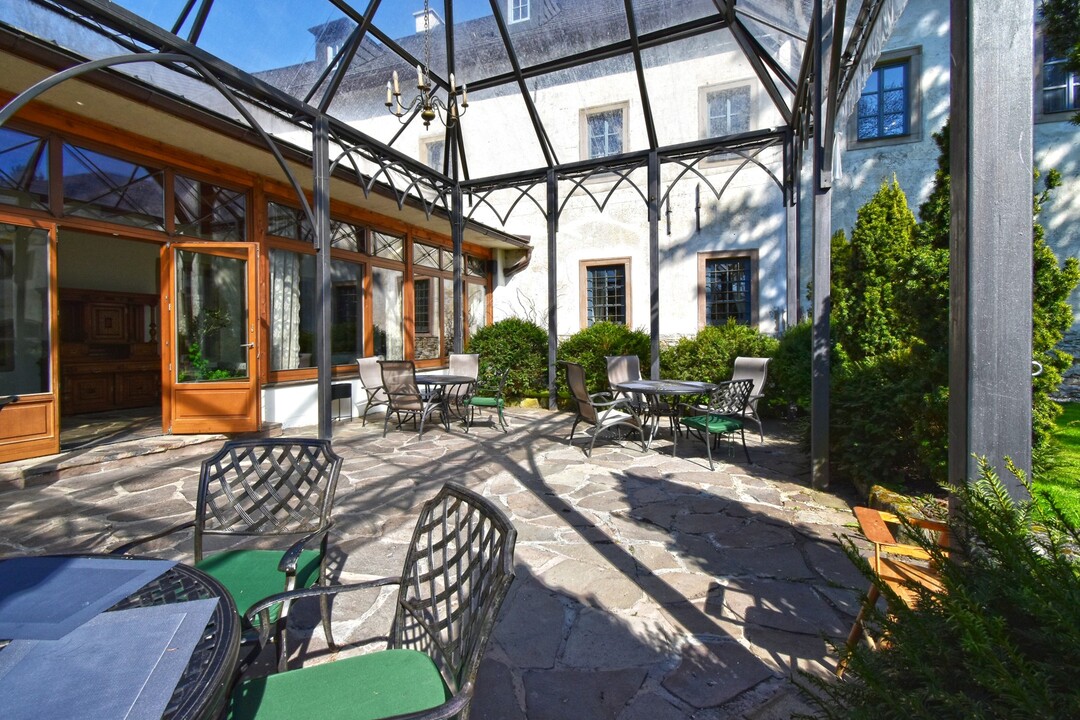 Počas teplých letných dní vás poteší rozsiahla prekrytá terasa s výhľadom do zámockého parku. Terasa poskytuje príjemné posedenie v zelenom prostredí, ktoré inšpiruje všetkých, ktorí hľadajú pokoj a únik od moderného uponáhľaného sveta. V zimnom období je zaujímavou náhradou terasy koridor pri reštaurácii.